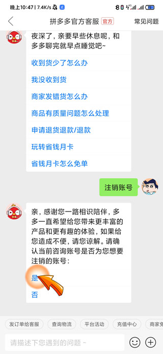 4、向客服发送注销账号信息,点击客服提示信息中的“是”选项即可。