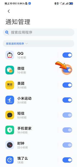 4、之后在通知管理页面中找到微信图标,将其右侧的“开关”按钮开启即可。