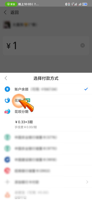 4、最后在付款方式中点击“花呗”选项,即可向对方进行花呗付款。
