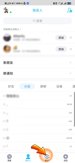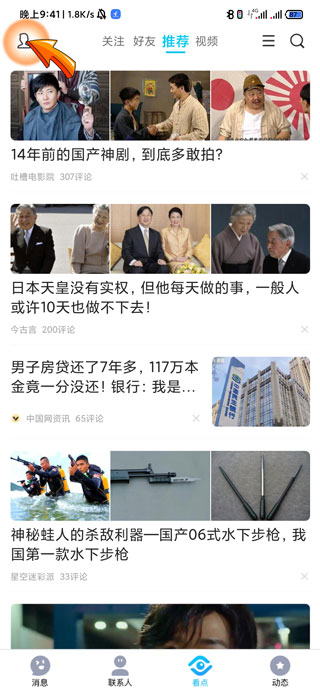 1、qq看点关闭推送消息首先需要打开QQAPP,点击首页下方的“看点”图标。
