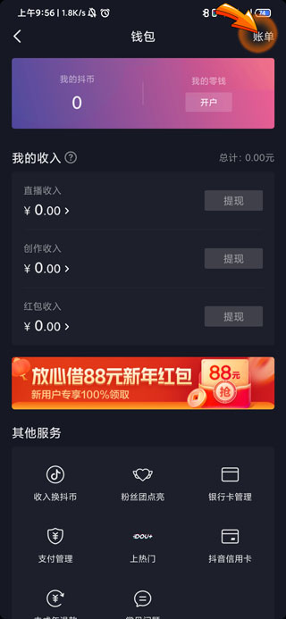 4、最后点击钱包页面右上角的“账单”选项即可。