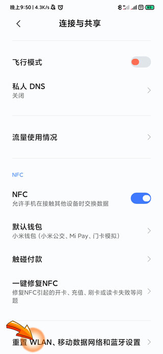 3、将页面滑到最底部,点击“重置wlan、移动数据网络和蓝牙设置”选项。