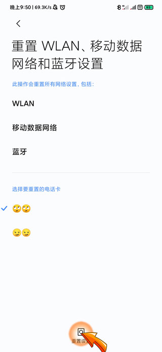 4、最后选择没有网络的“手机卡”图标,点击页面底部的“重置设置”选项即可。