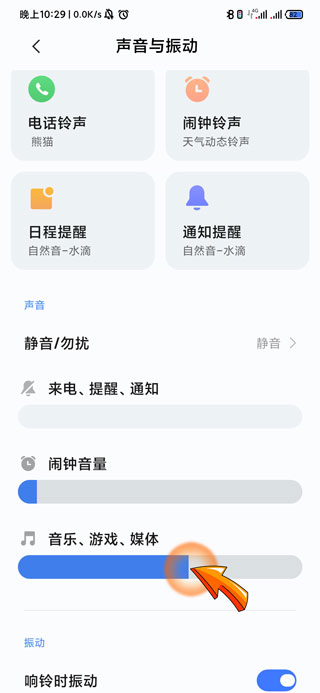 手机声音太大调整需要点击桌面上的“设置”图标,进入设置页面后点击“声音与震动”选项,然后将手机放置在需要调节声音的“音量条”上,向右侧滑动即可将手机声音调小。