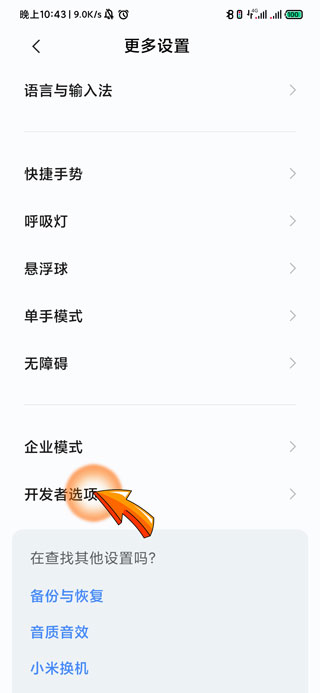 3、然后将页面滑到底部,点击“开发者选项”选项。