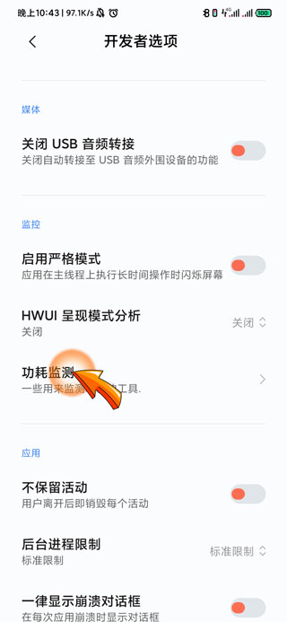 4、在开发者选项页面中找到并点击“功耗监测”选项。