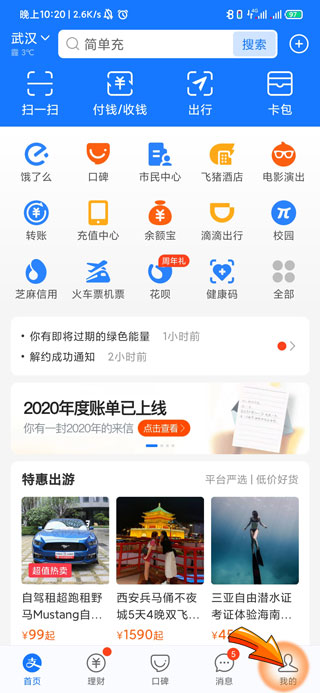 1、支付宝花呗调整付款顺序首先需要打开支付宝APP,点击页面右下角的“我的”图标。