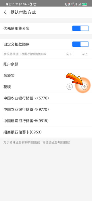 5、最后点击花呗右侧的上升“箭头”图标,将花呗顺序调整为首位即可。