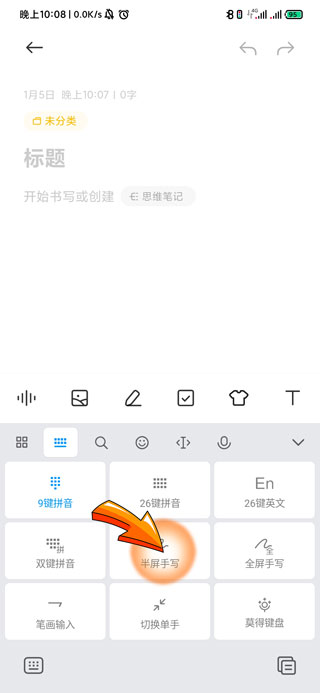 2、然后选择“半屏手写”选项或者“全屏手写”选项。