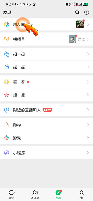 1、微信发布朋友圈首先需要打开微信APP,点击页面右下角的“发现”选项。