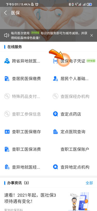 3、进入医保页面后,点击“医保电子凭证”选项。