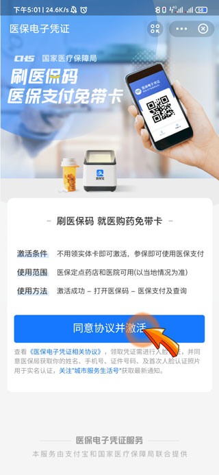 4、最后点击“同意协议并激活”选项即可激活支付宝医保码。