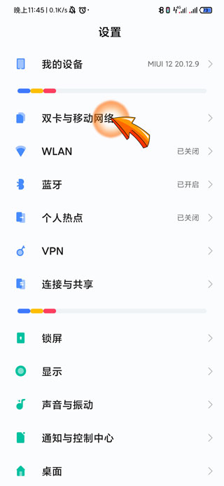 2、进入设置页面后,点击页面中的“双卡与移动网络”选项。