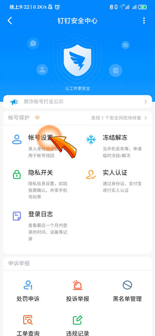3、然后再点击安全中心页面中的“账号设置”选项。