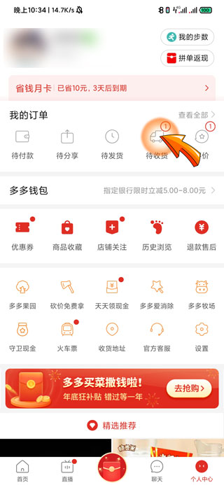 1、拼多多申请退款首先需要打开拼多多APP,点击首页右下角“个人中心”图标。