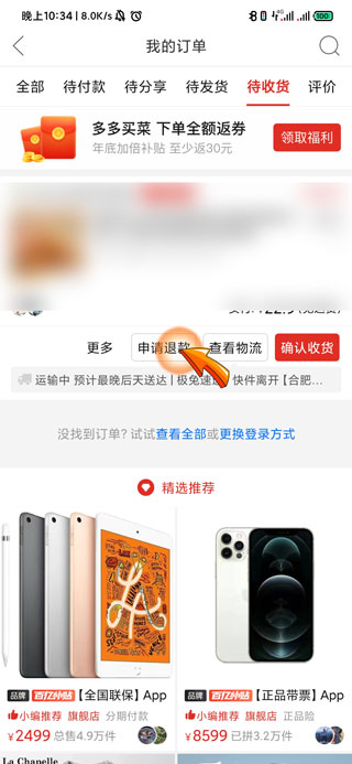 3、最后点击订单下方的“申请退款”选项,根据步骤完成退款流程。