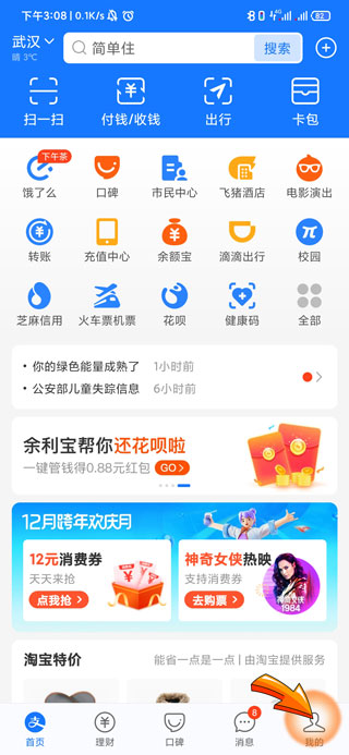 1、支付宝关闭免密支付首先需要打开支付宝APP,点击首页右下方的“我的”选项。