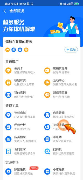 4、之后在管理工具中找到并点击“花呗收钱”选项。