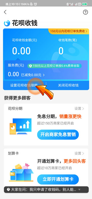 花呗开通150以上付款需要商家将收款金额设置为不限,首先需要打开支付宝APP,点击页面右下角的“我的”图标,然后点击“商家服务”,再点击“更多”图标,之后点击“花呗收钱”选项,最后将花呗收钱设置限额调整为不限即可。