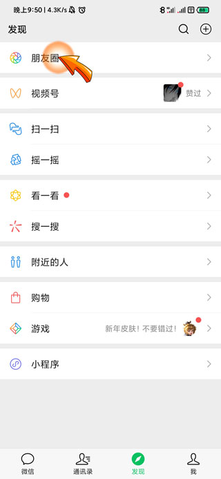 2、然后点击发现页面顶部的“朋友圈”选项。