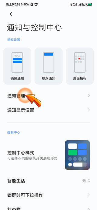 2、然后点击设置页面中的“通知与控制中心”选项。