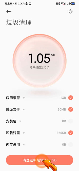 3、等待手机检索出缓存垃圾后,点击页面底部的“清理选中垃圾”选项即可。