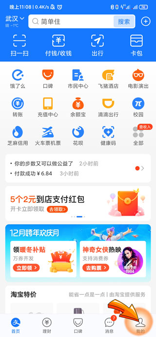 1、支付宝零钱明细删除记录首先需要打开支付宝APP,点击页面右下方的“我的”选项。