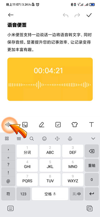 备忘录录音需要在手机便签功能中进行,首先需要打开手机桌面上的“便签”图标,进入页面后,点击“语音便签”选项,然后点击输入框左上角的“录音”图标,即可开启录音。