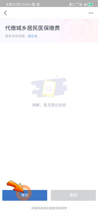 4、在代缴城乡医保页面中,点击左下角的“增加”选项。