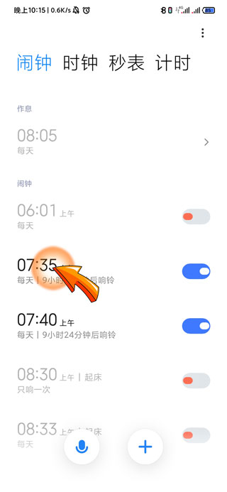 2、进入闹钟页面后点击需要设置的“闹钟时间”。