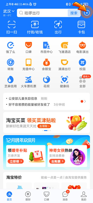 1、支付宝查看收款码首先需要打开支付宝APP,点击首页右上角的“加号”选项。