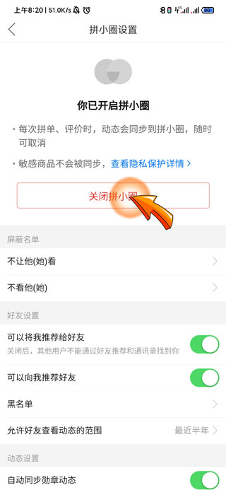 4、最后在拼小圈设置中点击“关闭拼小圈”选项即可。