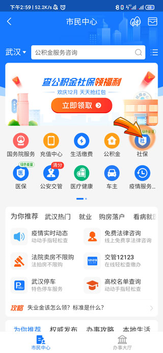 1、支付宝绑定社保卡需要打开支付宝APP,点击“市民中心”图标。