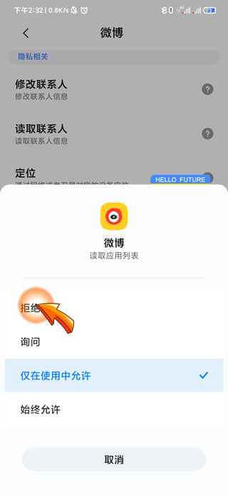 设置不让微博打开淘宝需要打开手机“设置”,在设置页面中点击“应用设置”选项,然后点击“应用管理”,在应用管理中找到并点击“微博”图标,再点击“权限管理”选项,之后点击“读取应用列表”选项,最后点击“拒绝”选项即可。