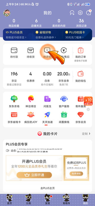 2、然后找到并点击我的页面中的“待评价”选项。