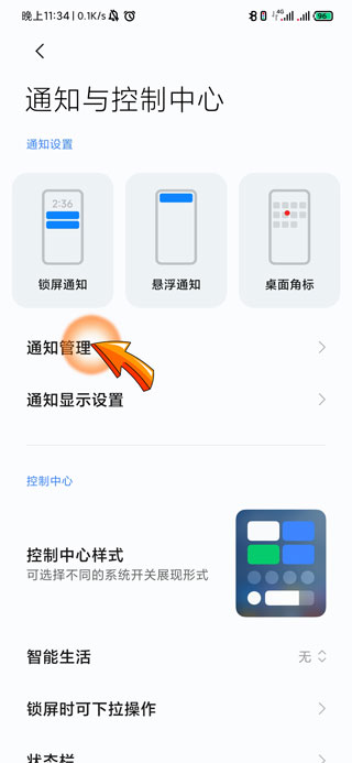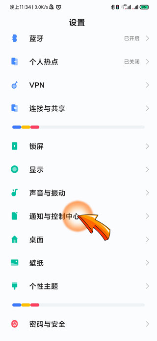 2、然后在设置页面中找到并点击“通知与控制中心”选项。