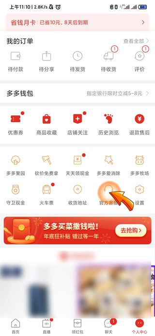 1、拼多多订单审核中需要打开拼多多APP,点击首页右下角的“个人中心”图标。