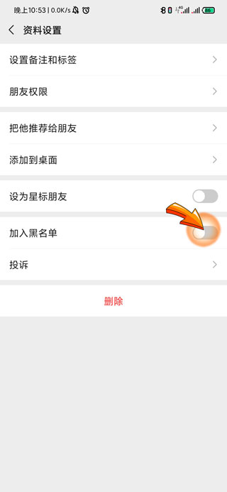 3、最后点击打开“加入黑名单”右侧的开关,即可将好友拉入到黑名单中。