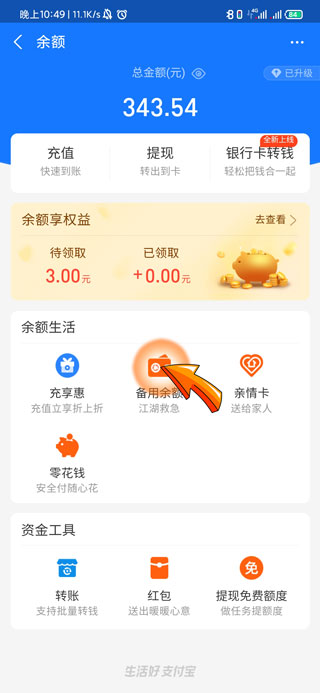 3、再点击余额页面中的“备用金额”图标。