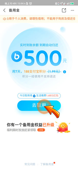4、最后点击“去取用”选项即可使用备用金。