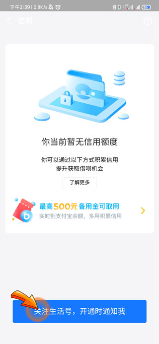 3、如果达到规定信用额度则可以直接进行开通,如果未达到则需要点击下方的“关注生活号,开通时通知我”选项等待开通。