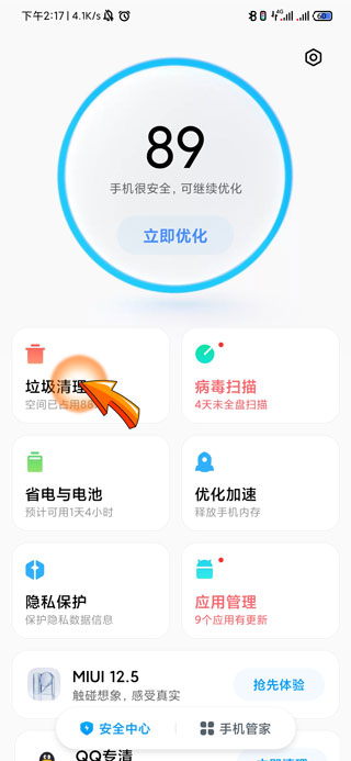 2、进入手机管家页面后。点击“垃圾清理”选项。