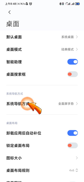 3、在桌面页面中,点击中部的“系统导航方式”选项。