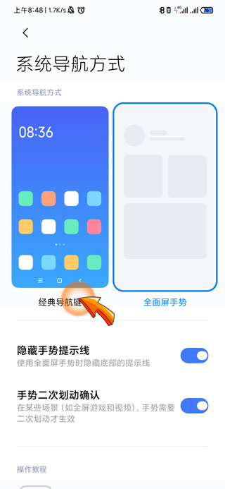 4、最后定金图标页面下方的“经典导航键”选项,即可将手机下方三个按钮恢复。
