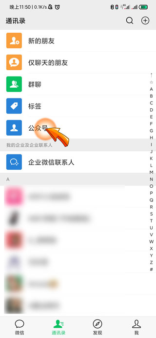 1、添加微信公众号需要打开微信APP,点击首页中的“公众号”选项。
