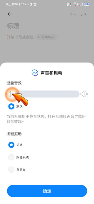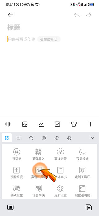 手机关闭打字声音需要打开打字框,点击左上角的“四口”图标,然后上滑页面找到并点击“声音和震动”选项,将“键盘音效”声音关闭,最后点击页面下方的“确定”选项即可。