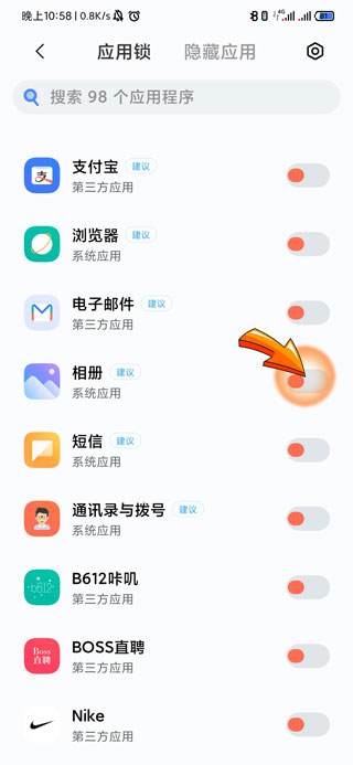 5、设置完密码后最后在应用中找到“相册”选项,点击打开右侧的开关,图库密码就设置完成了。