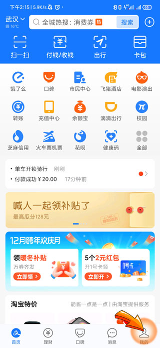 1、支付宝解除微博会员自动续费首先需要打开支付宝APP,点击页面右下角“我的”选项。