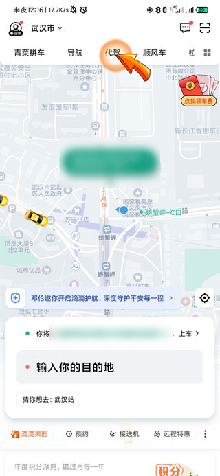 2、手指向左滑动,出现“代驾”选项后,点击进入。