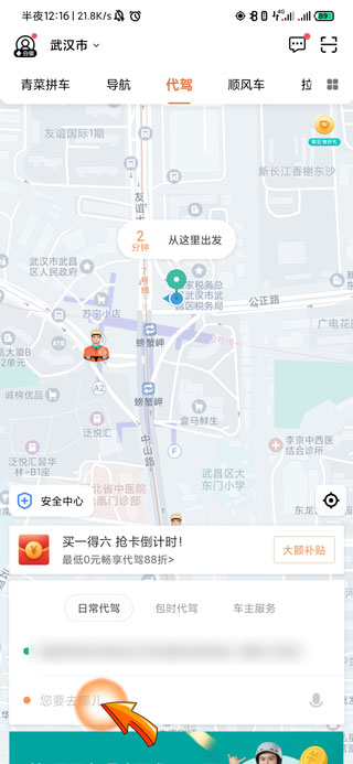 滴滴代驾需要打开滴滴出行APP,将手指放置“青桔骑行”和“青菜拼车”中间的空白区域,手指向左滑动,出现“代驾”选项后,点击进入,然后在底部“输入栏”里输入需要去的地方,最后点击“呼叫代驾”即可。